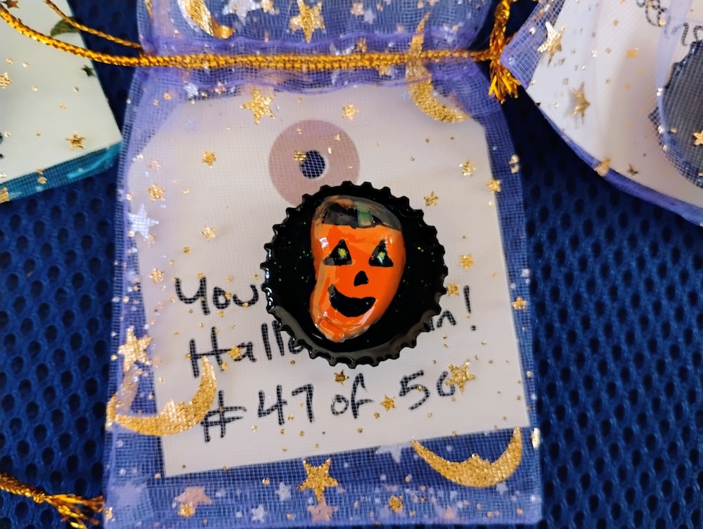 I have made 50 “HallowBeans” to pass out on Halloween night! My spooky companion and I will hit the French Quarter and Marigny neighborhoods (and possibly others) with our fanny packs filled with these Halloween-themed magnet charms to hand out to lucky celebrants.